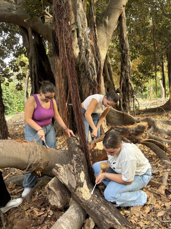 Arriviamo sotto un grande ficus dove un grande ramo giace. Si estraggono da una cassetta gli attrezzi, le sgorbie e i martelli di legno, freneticamente cominciano a battere e ad incidere la corteccia, il legno. I ragazzi ci appaiono come piccole formiche laboriose intente nel loro frenetico travaglio, felici e increduli di una libertà inaspettata.