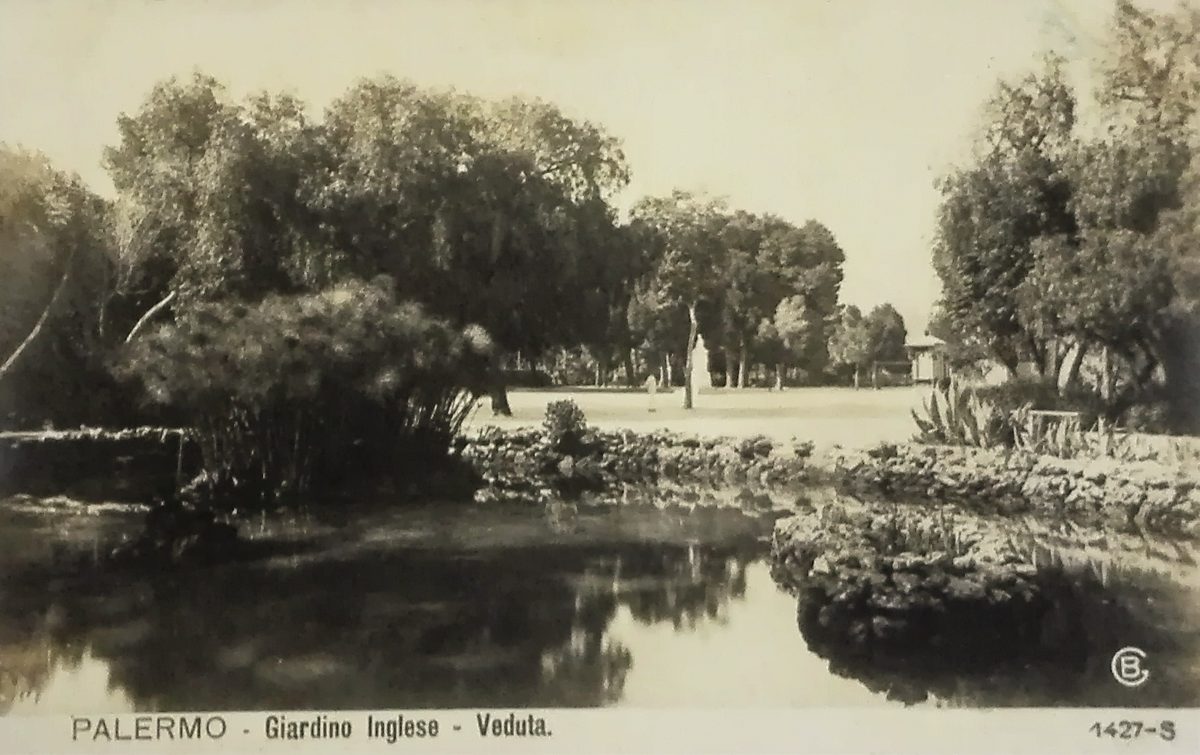 G.B.F. Basile, 1850-1851, Giardino Inglese, Palermo, la collina con il Castello arabo e il lago centrale negli anni Trenta del XX secolo, cartolina (coll. privata, Palermo)
