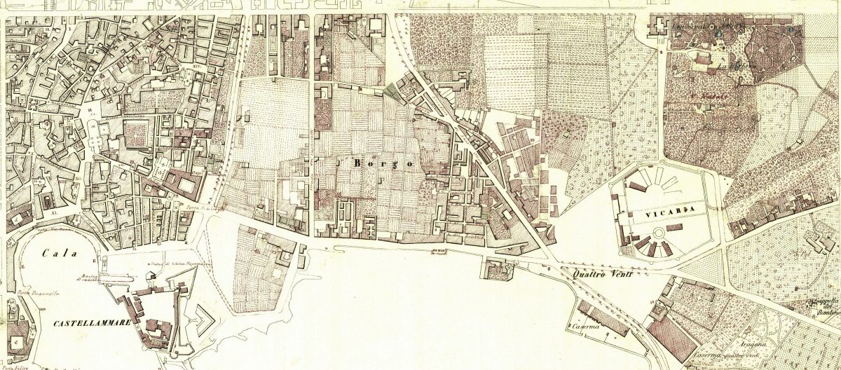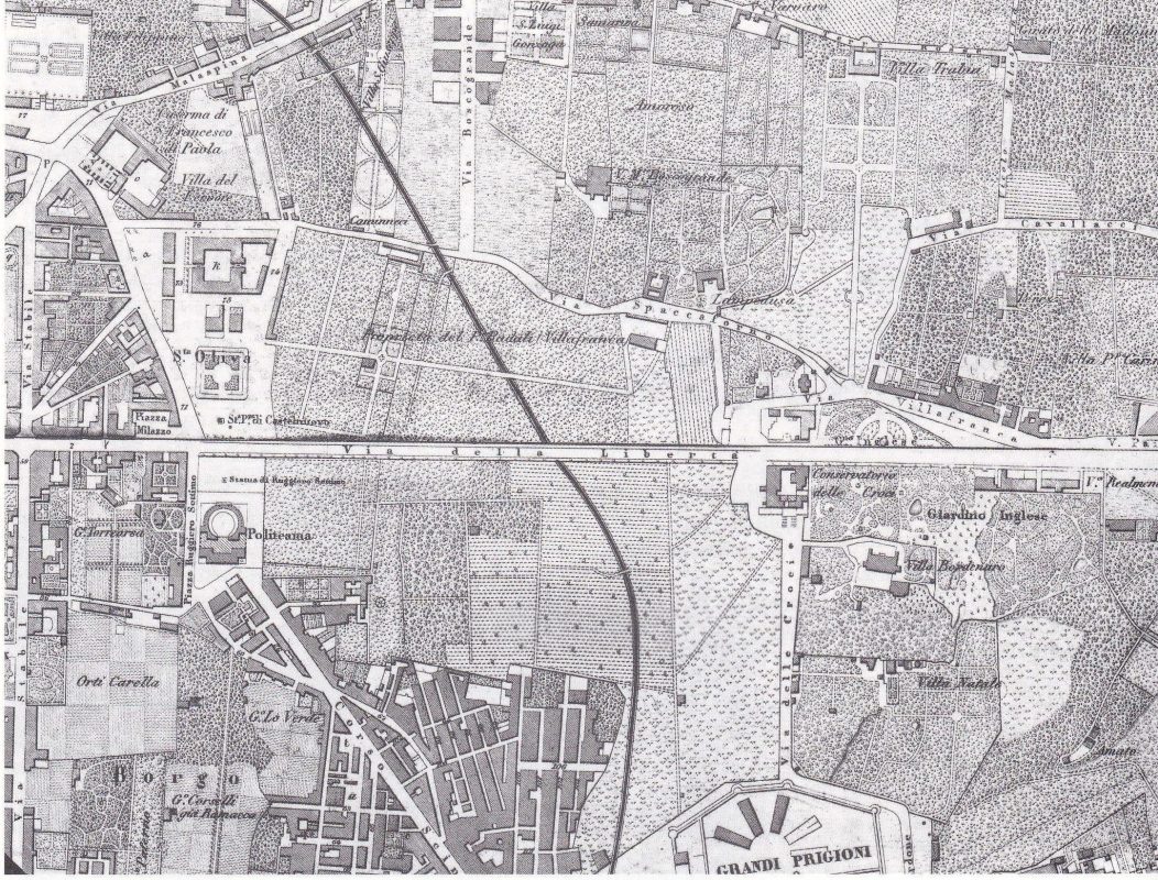 G.B.F. Basile, 1850-1851, Giardino Inglese, Palermo, il disegno del Bosco e la Pineta prima del taglio della via del Giardino (in alto), nella Pianta topografica della città di Palermo e suoi dintorni, 1864, rett. 1873, stampa da incisione (coll. privata, Palermo): a sinistra del Reclusorio con la chiesa e l’antica scalea si riconosce l’invaso dell’impianto del lazzaretto del 1575. 16. G.B.F. Basile, 1850-1851, Giardino Inglese, Palermo, il disegno del Bosco e la Pineta prima del taglio della via del Giardino (in alto), nella Pianta topografica della città di Palermo e suoi dintorni, 1864, rett. 1873, stampa da incisione (coll. privata, Palermo): a sinistra del Reclusorio con la chiesa e l’antica scalea si riconosce l’invaso dell’impianto del lazzaretto del 1575.