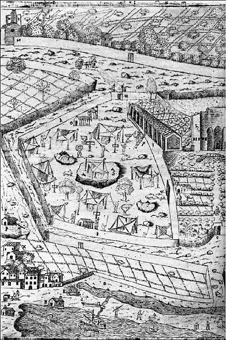 Il sito del Giardino Inglese nel 1575. Si riconosce la villa di Luca Cifuentes, già di Pietro di Luna duca di Bivona, con il portico a tre archi con scalea a tenaglia, la flora antistante e il parco della conigliera “ampio e ispatioso, esposto al sole e al vento da ogni lato” e circondato da mura; a sinistra è visibile il lazzaretto approntato in occasione della peste così documentato dal medico G.F. Ingrassia in Informatione del pestifero, et contagioso morbo il quale affligge et have afflitto questa città di Palermo…nell’anno 1575 et 1576, Palermo 1576 13. Il sito del Giardino Inglese nel 1575. Si riconosce la villa di Luca Cifuentes, già di Pietro di Luna duca di Bivona, con il portico a tre archi con scalea a tenaglia, la flora antistante e il parco della conigliera “ampio e ispatioso, esposto al sole e al vento da ogni lato” e circondato da mura; a sinistra è visibile il lazzaretto approntato in occasione della peste così documentato dal medico G.F. Ingrassia in Informatione del pestifero, et contagioso morbo il quale affligge et have afflitto questa città di Palermo…nell’anno 1575 et 1576, Palermo 1576