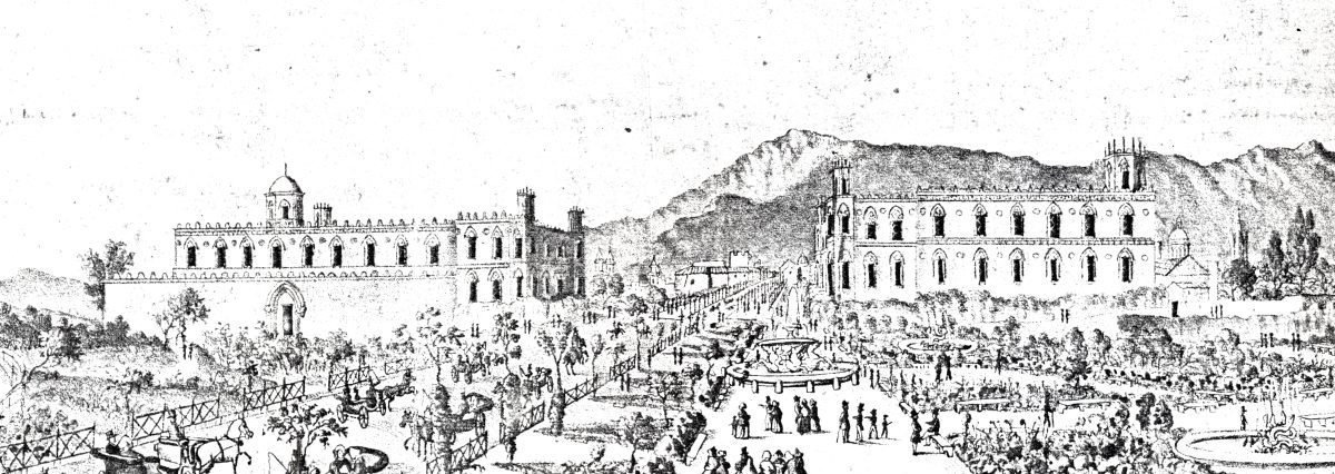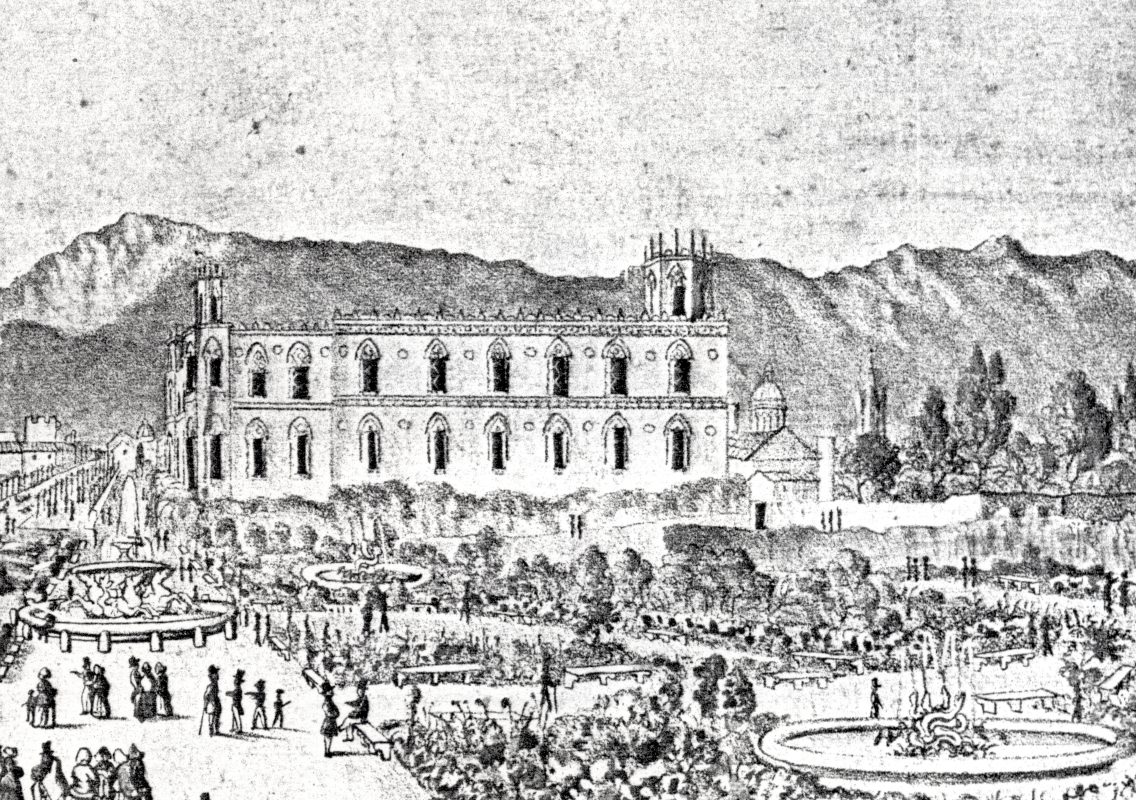 Veduta del Giardino Inglese con la via della Libertà, Parterre con le fontane e l’edificio di testata in chiave neomedievale; ricostruzione immaginaria del 1870 ca., particolare (stampa luminosa su carta; coll. F. Riccobono, Messina) 24. Veduta del Giardino Inglese con la via della Libertà, Parterre con le fontane e l’edificio di testata in chiave neomedievale; ricostruzione immaginaria del 1870 ca., particolare (stampa luminosa su carta; coll. F. Riccobono, Messina)