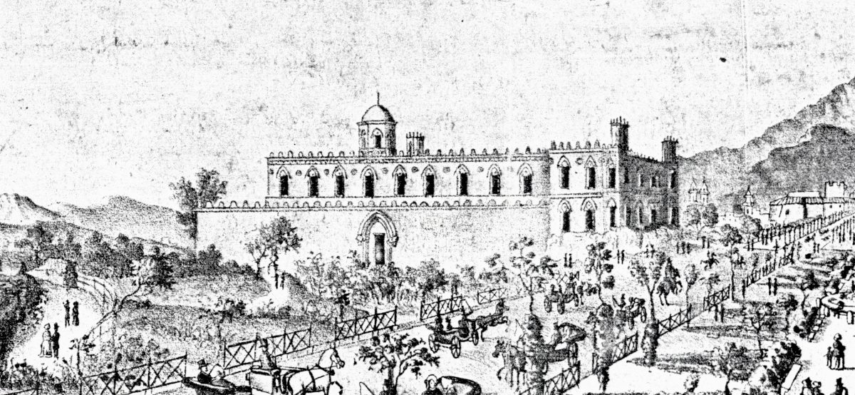 Veduta del Giardino Inglese con la via della Libertà, il Reclusorio delle Croci secondo il progetto autografo di G.B.F. Basile del 1850; ricostruzione immaginaria del 1870 ca., particolare (stampa luminosa su carta; coll. F. Riccobono, Messina) 19. Veduta del Giardino Inglese con la via della Libertà, il Reclusorio delle Croci secondo il progetto autografo di G.B.F. Basile del 1850; ricostruzione immaginaria del 1870 ca., particolare (stampa luminosa su carta; coll. F. Riccobono, Messina)
