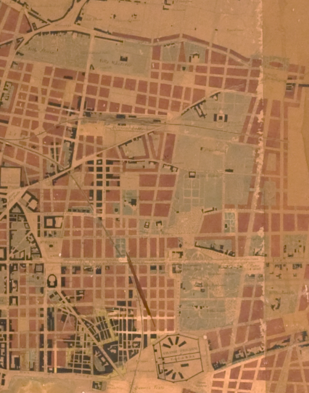 Il tracciato della via della Libertà dalla piazza Ruggiero Settimo con il Politeama Garibaldi al Reclusorio delle Croci con il Giardino Inglese, nella Pianta topografica della città di Palermo e suoi dintorni, 1864, rett. 1873, stampa da incisione (coll. privata, Palermo) 2. Il tracciato della via della Libertà dalla piazza Ruggiero Settimo con il Politeama Garibaldi al Reclusorio delle Croci con il Giardino Inglese, nella Pianta topografica della città di Palermo e suoi dintorni, 1864, rett. 1873, stampa da incisione (coll. privata, Palermo)